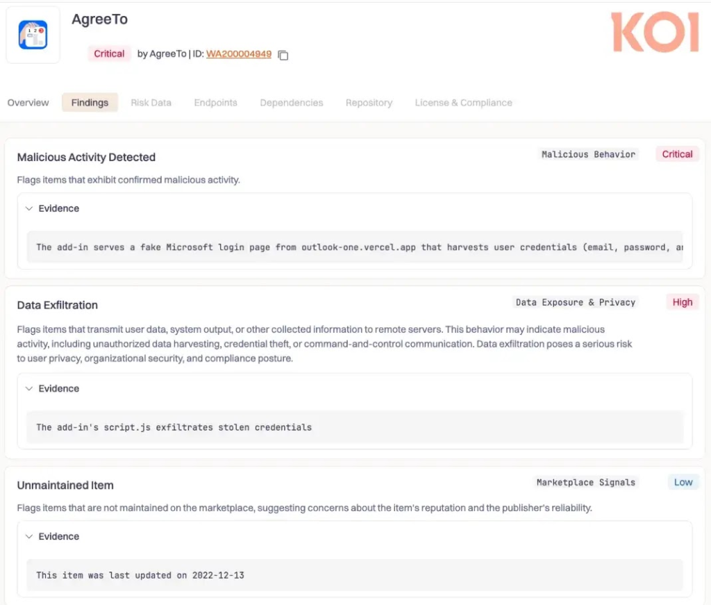 Outlook add-in phishing via AgreeTo demonstrates supply chain persistence risks, compromising confidentiality of credentials and financial data in trusted interfaces. Koi AI disclosure prompts ecosystem-wide manifest and dependency reviews.